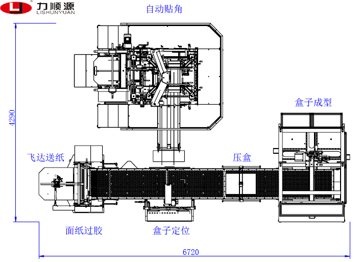 傳統(tǒng)的天地蓋紙盒在完成印刷和切角之后,尚需以來人工或者半人工輔助設備進行一道釘機打釘的機械加工工序,即通過釘機打釘依次完成單角的貼合(四個角共需貼合四次),或者進行一道膠水粘貼工序,這種做法的生產效率較低,增加了原料與生產成本,而且單位人工效率低,提高了總成本。為了解決這些困擾,全自動智能制盒機應運而生,力順源全自動智能天地蓋制盒機就是其中的代表。