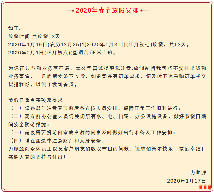 正值傳統(tǒng)節(jié)日“春節(jié)”來(lái)臨之際,在此先向各位新老客戶和廣大朋友拜個(gè)早年!預(yù)祝大家新春愉快!